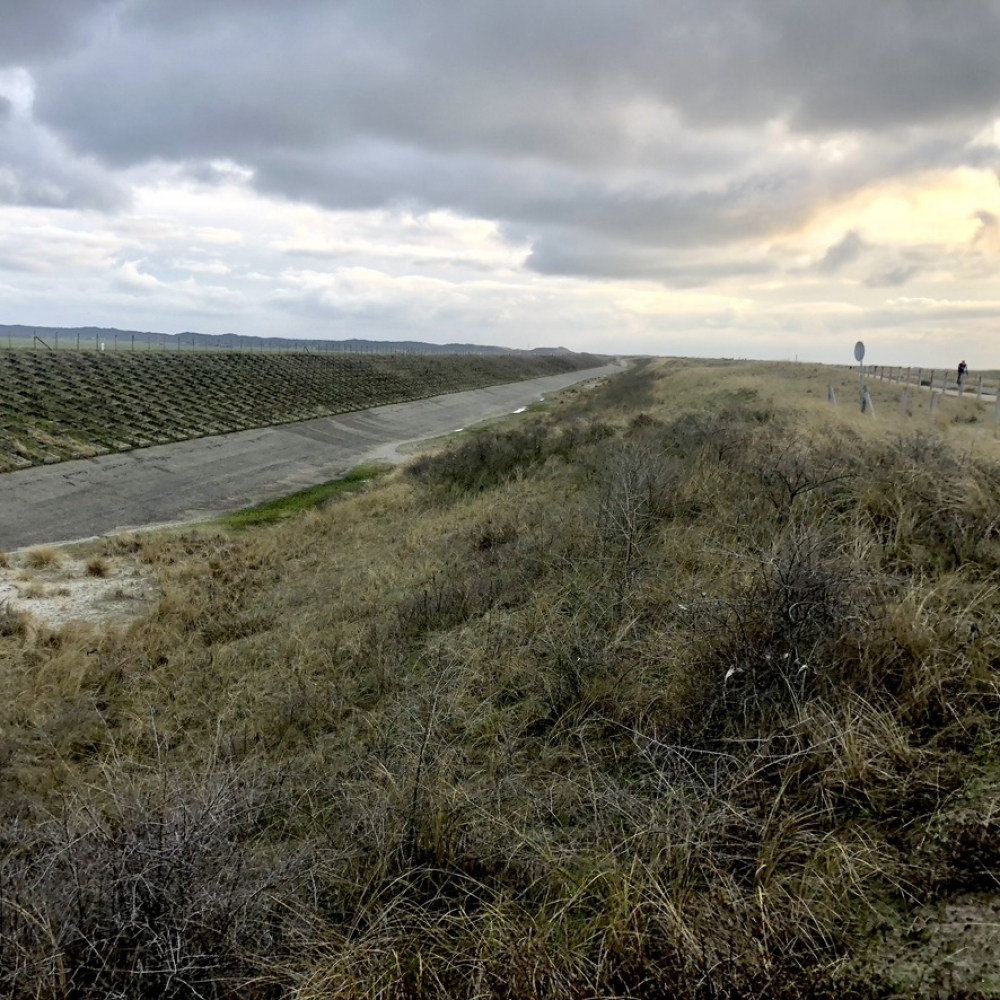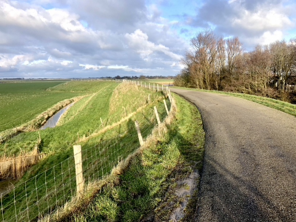 En dan een verrassing. Ik verwacht een dijk zoals een dijk hoort te zijn. Aan de ene kant de zee, aan de andere kant land. Zo was het vast eerder wel (en zo is het nog steeds met de Westkapelse Zeedijk, daar was ik afgelopen najaar nog met fiets), maar nu niet meer.